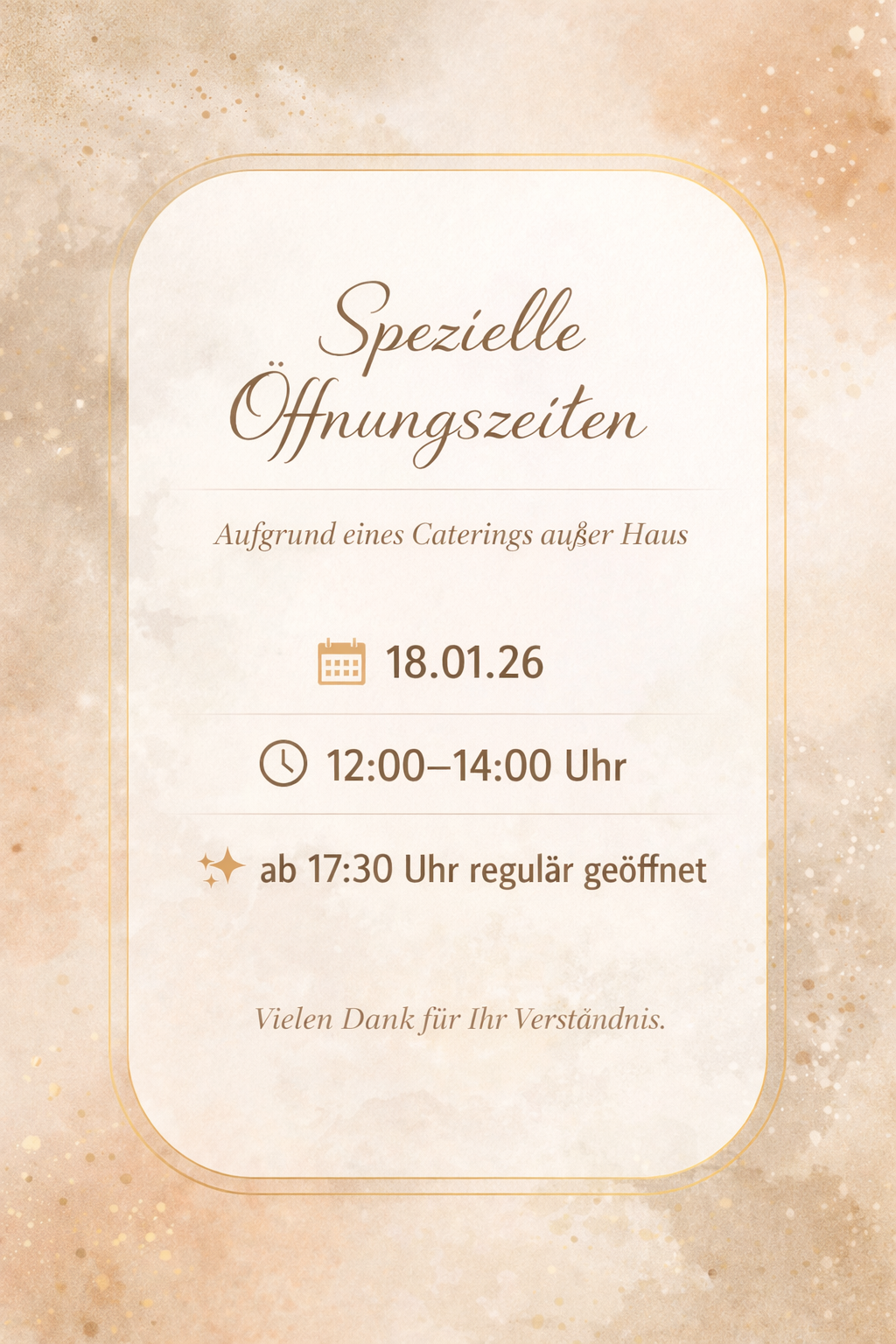 Wir sind aufgrund eines Catering von 14:00 - 17:30 Uhr geschlossen.
